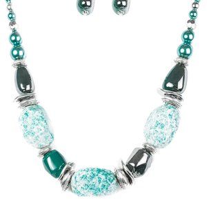 Misshape beads with turquoise splatter look and detailed multi look and multi shape silver beads. Comes with matching fishhook earrings.