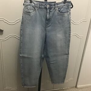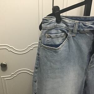 These chic cropped jeans featuring bold side studs are an on-trend look. Size 12, 31 inch waist. Color is light indigo. Inseam approx. 23 inches. 99% cotton, 1% spandex. Mom Jean. Studs along both sides.
