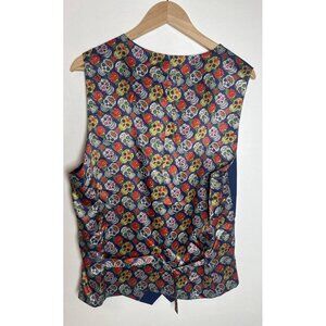 The vest is a single-breasted, five-button style with a solid dark blue exterior and a contrasting, colorful interior lining. A distinctive wool vest that combines classic tailoring with a bold, artistic interior print featuring colorful sugar skulls and roses.