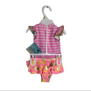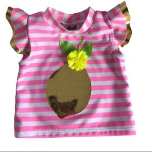 Absolutely Adorable!!! The two piece set includes a ruffled sleeve top with a sequined lemon design & a lemon printed ruffled bikini bottom