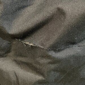As seen in last two pictures there is a tear in the outer layer a few inches below the right knee which is about 1 1/2" in length. Should be able to patch.