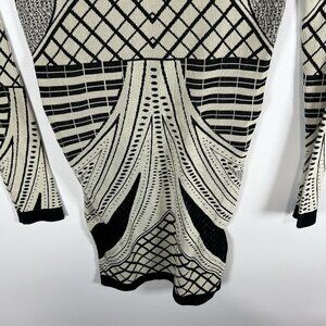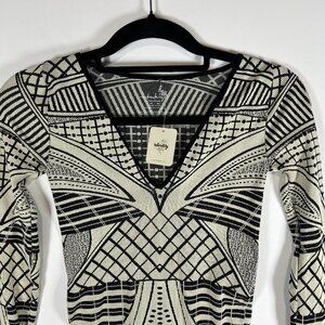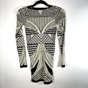 The NWT Intimately Free People Mini Dress in size M/L is a stylish and versatile piece perfect for travel, parties, or casual wear. Made with a stretchy black and cream animal print fabric, this dress features a V-neckline, long sleeves, and a pullover closure for easy wear. With a bohemian theme and bodycon style, this lightweight nylon and spandex dress is machine washable and perfect for summer, fall, or spring seasons. Ideal for those looking for a chic and comfortable outfit that can be dressed up or down effortlessly.