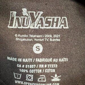 The NWT InuYasha Spencer's Black 100% Cotton Graphic Print Tee T-Shirt in size small is a must-have for fans of the anime series. Featuring a crew neckline, short sleeves, and a regular fit, this T-shirt is comfortable and stylish. The graphic print of InuYasha adds a touch of personality to this classic black shirt, making it a versatile piece for any season. Machine washable and made of high-quality cotton fabric, this shirt is a great addition to any anime enthusiast's wardrobe.
