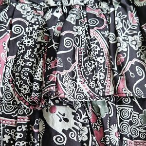 Stylish black and pink patterned skirt with ruffle details. Perfect for any occasion.