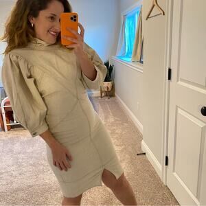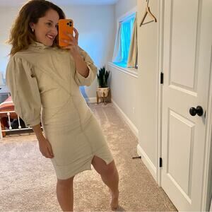 Wow, I absolutely adore this super stunning, brand new with tags RARE designer Isabel Marant Etoile cream oatmeal neutral colored cotton structured mockneck long puff sleeve bodycon fit mini dress
