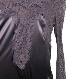 • Features: Side zip up, Button closure at back upper, Black Midnight color name but has a dark purple tint to it, High low asymmetric hemline with ruffle accent, Satin fabric with see through lace upper, long sleeves, and center inset, High neckline, Unlined, Dolores Dress by Isabel Marant