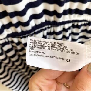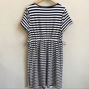 Navy blue and white stripes, ties at side, short sleeves, slits on sides