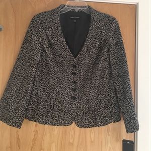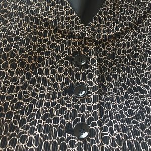 Soft, crinkled-crepe black & white patterned fabric makes this suit perfect for office-to-cocktail party. Exquisitely detailed with 3 1/2" pleating surrounding the jacket's hem. Straight skirt is 23" in length. NWT; smoke-free home.