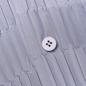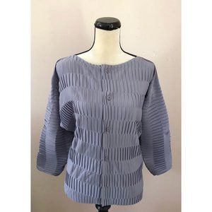 'Wave Stripe' cardigan from Issey Miyake. Delicate woven fabric pressed into a pattern of undulating bands. Pale blueish-grey. Button front, oversized fit, long sleeves. Can be worn back to front as a blouse. New with tags and flawless!