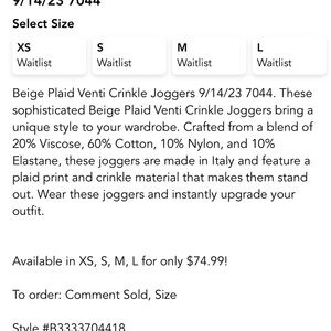 New Plaid Italian Joggers in Beige/Green by Venti6 in size Medium. Joggers are perfect for the fall and winter or you can rock them in the summer with a band tee! Comfortable, Stretchy, and Cute all in one! Love them but unfortunately I have to downsize because I have too many per the hubby!