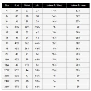Sizing tips: Every designer cuts their dresses differently & according to their size chart. Please measure yourself (in inches) before ordering & follow our size chart (pictured under the main dress picture). If you are in between sizes or unsure of the fit, choose a size up, as it is easier for your seamstress to take in rather than out. Please refer to the size chart in our images section.