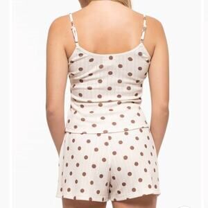 Adorable Cami & Short Set! Ivory polka dot set, v neckline, sleeveless cami, lace detailing. Straps are adjustable. Shirts have drawstring and pockets. Super soft material. 96% POLYESTER 4% SPANDEX