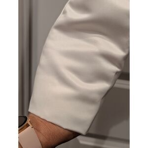 New With Tags, Size 14: This Ivory Satin Bolero by Christian Michele is a stunning, glamorous addition to any formal outfit. Including a great gift for a bride! This Bolero can be used over a wedding dress on a chilly evening, or for a formal daytime or evening event. Sourced from the Y2K era, this piece is timelessly chic. The bolero is designed with a sleek satin shell and a soft, plush faux fur shawl collar. The original rhinestone pin is included for optional wear. Perfect condition, as it is NWT with a retail price of $99.99. The cropped, long-sleeve fit is ideal for layering over cocktail dresses, evening gowns, or any special occasion attire. Material is 100% Polyester for both shell and lining.