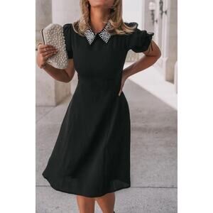 This chic black dress features a timeless pearl collar, enhancing its knee-length silhouette. It deftly combines elegance with playful charm, making it perfect for a variety of occasions, from daytime outings to evening events. The flattering A-line cut ensures that it suits a range of body types, while the unique collar adds a touch of sophistication.