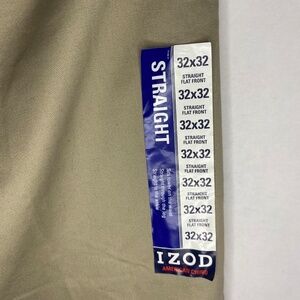 NWT Izod Flat Front Straight Men’s American Chino Pants, Tan Golf Slacks, 32x32, NEW. In new condition without rips, tears or stains. Sits lower on the waist and straight through the leg. Straight to the ankle. 100% cotton.
