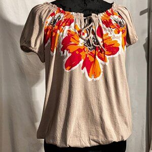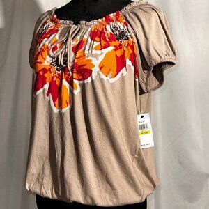 NWT Izod Peasant Blouse, Brown, Orange Flowers, Size Medium