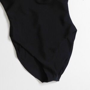 Scoop neckline and back ~ Wide comfortable fixed shoulder straps ~ Optional/Removable padding in the cups ~ Center seam down the backside ~ Medium coverage seat ~ Fully lined ~ Solid black … classic!!