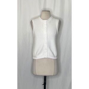 Rounded neckline ~ Sleeveless ~ Snap closures all the way down the front ~ Straight hemline ~ Soft unlined cotton blend knit fabric … fabric has a texture to it ~ Solid white … so versatile!!