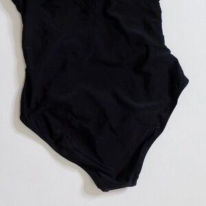 One shoulder design ~ Slanted neckline and upper back ~ Single shoulder strap ~ Flattering ruching down the side seams ~ Moderate seat coverage ~ Fully lined ~ Solid black color