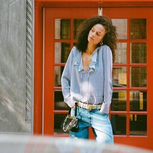 NOTE: the color of the top for sale is IVORY. Photos of the model wearing blue/stripe are for style reference only - same style, different color.
