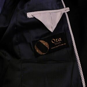 Notched lapel style collar at neckline ~ Long sleeves … four buttons near the ends of the sleeves ~ Single breasted … single button closure on the front ~ Two inset flap pockets on the lower front ~ Single interior pocket in the lining ~ Straight hemline … slit/vent on the back/bottom hem ~ Fully lined ~ Wool blend fabric … fabric has some light stretch ~ Solid black … lining is a navy blue