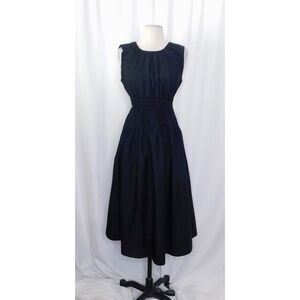 Rounded neckline … slit on the back of the neck with a single button closure ~ Sleeveless ~ Waistline is defined by rows of stretchy smocking ~ Skirt is pleated and full ~ Two inset side/seam pockets in the skirt ~ Straight hemline ~ Midi length ~ Pullover styling ~ Bodice is lined … skirt is unlined ~ Soft non-stretch 100% cotton poplin fabric ~ Solid black … so versatile!