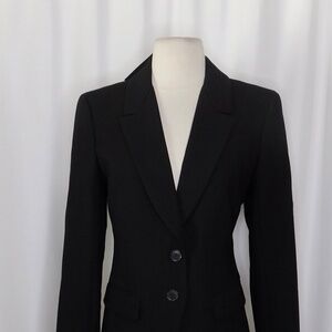 Notched lapels or collar at a V neckline ~ Long sleeves … four buttons near the end of each sleeve ~ Fitted silhouette that is slightly nipped in at the waist ~ Two button closures on the lower front ~ Two inset welt pockets with flaps on the lower front ~ Straight hemline … vent/slit on the back/bottom hem ~ Fully lined … Two interior pockets in the lining ~ Four-Season woven fabric with light stretch ~ Solid black … interior lining is blue