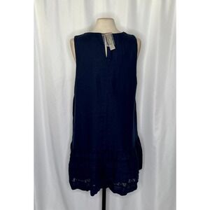 Rounded neckline … slit with a single button closure on the back of the neck ~ Sleeveless ~ Shift silhouette with a drop-waist style ~ Tiered ruffles around the bottom of the skirt/hem … the ruffles have lace trims/accents ~ Straight hemline ~ Above knee length ~ Pullover styling ~ Fully lined ~ Exterior shell is a woven non-stretch 100% linen fabric ~ Solid navy blue including the lace trims