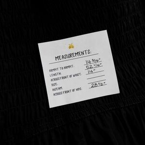Rounded neckline ~ Short puffed sleeves with raglan shoulder seams ~ Bodice is smocked/stretchy ~ Skirt is pleated and full ~ Two inset side/seam pockets in the skirt ~ Straight hemline ~ Midi length ~ Concealed back zipper closure ~ Crisp unlined non-stretch poplin fabric ~ Solid black … so versatile!