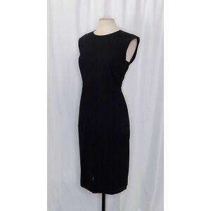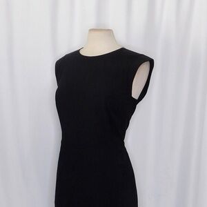 Rounded neckline ~ Short cap sleeves ~ Nipped in at the waist ~ Two inset slanted pockets on the front under the waist ~ Straight hemline slit/vent on the front/center of the hemline ~ Concealed back zipper closure ~ Fully lined ~ Fabric is an Italian wool blend … fabric has some minimal to light stretch ~ Solid black … classic!
