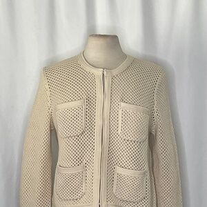 Rounded neckline ~ Long sleeves ~ Hook-and-Eye closures down the front ~ Four small patch pockets on the front … two at the chest and two on the lower front ~ Straight hemline ~ Cropped length ~ Body, sleeves and pockets are made from an open-weave pointelle style knit ~ Solid trims at the neckline, front edges, tops of the pockets, hemline and ends of the sleeves ~ Solid ivory … color is called “Warm Sesame”
