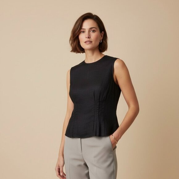 Rounded neckline … slit on the back with a single button closure on the back of the neck ~ Sleeveless ~ Pleating on the front and back at the waist ~ Straight hemline ~ Soft unlined non-stretch woven Ramie fabric ~ Solid black … so versatile!!
