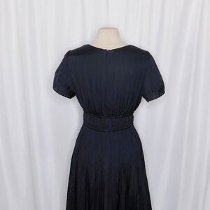 V neckline ~ Short fluttery sleeves ~ Elastic/Stretchy waist defined by two inset ties on the front ~ Skirt is pleated and full ~ Straight hemline … offset slit on the front hem ~ Midi length ~ Concealed back zipper closure ~ Bodice is lined … sleeves and skirt are unlined ~ Soft non-stretch fabric ~ Solid black … so versatile!!