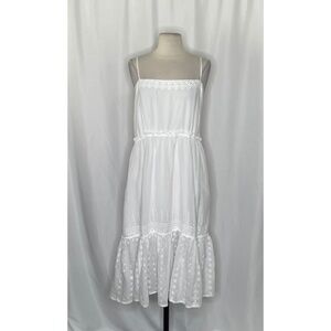 Squared or straight neckline and upper back … keyhole opening with a button closure on the upper back ~ Sleeveless ~ Adjustable spaghetti style shoulder straps ~ Empire bodice ~ Ruffled trim at the waistline ~ Ruffled tier around the bottom of the skirt ~ Straight hemline ~ Pullover styling ~ Lined to the ruffle/tier of the skirt ~ Soft non-stretch woven cotton voile fabric ~ Floral embroidered details at the neckline and around the ruffle/tier of the skirt ~ Solid white including embroidered details