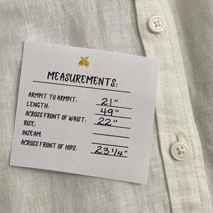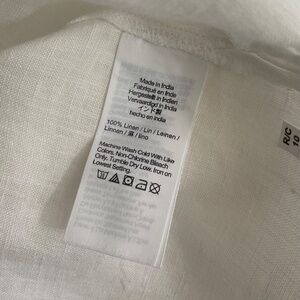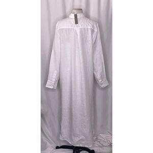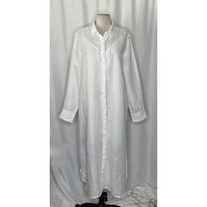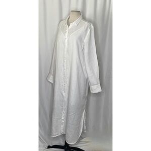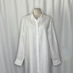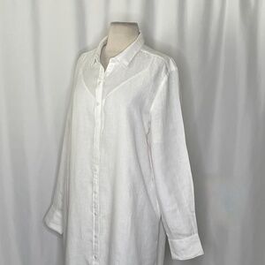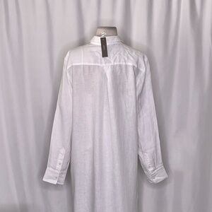Point collar at neckline ~ Long sleeves with buttoned cuffs ~ Button closures all the way down the front ~ Curved hemline ~ Midi length ~ Tunic or shirtdress styling ~ Comes with separate tank style slip/lining ~ Soft non-stretch woven 100% linen fabric ~ Solid white … so versatile!!
