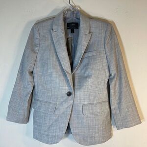 Made from ultra fine super 120"s Merino Wool, this gorgeous light grey blazer by J. Crew is perfectly designed for year round wear. With classic, clean lines, and a sophisticated silhouette, this jacket is ideal for the office but also does double duty as a smart casual piece when paired with polished denim and loafers. Featuring a single button closure in front, notched lapels, and three functional exterior pockets along with an interior pocket, this blazer is a true classic that will be worn for years to come. 3/4 length sleeves gives this blazer a more up to date look and is also great for petite frames. Light grey.