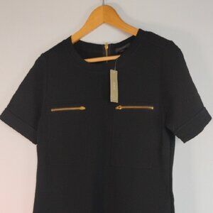 New with tag sleek black mini dress with bold gold zipper details. Crew neck. Perfect for a stylish look. Made from 70% Wool 27% Nylon materials. Ideal for office, casual wear or any occasion. No Flaws. Please zoom in photos for the best description.
