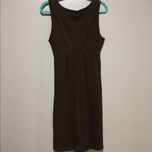 J Crew chocolate brown knee-length knit dress, perfect for the summer! Scoopneck, with some gathering in the middle, and an attached string belt tie. Nice, comfy feel (57% cotton, 38% modal, 5% spandex) that's fairly thick fabric. This would be a great dress for the office under a cardigan or the weekend...dress it up or down.