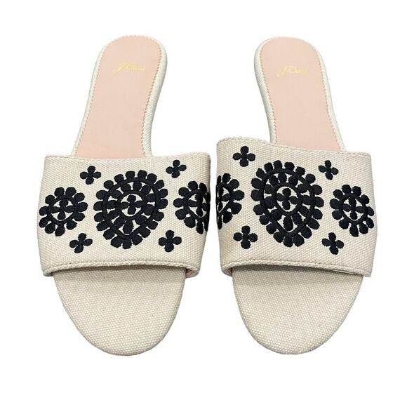 NWT J. Crew Cream & Black Floral Embroidered Slide Sandals Size 8 Summer Linen