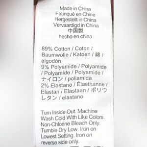FABRIC: 89% cotton/9% polyamide/2% elastane.  Machine washable.
