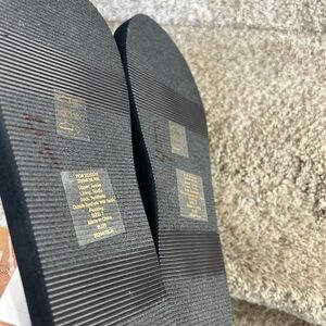 Cute flip flops! All American and patriotic. There are a couple very small indentations on the heel of the foot bed. See pics. Otherwise perfect shape.