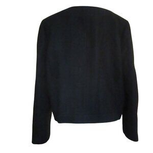 This black textured jacket is tailored for a polished, professional look. The gold buttons and front pockets elevate its classic, versatile design. The jacket is new with tags. In size 16. Please see the photos.