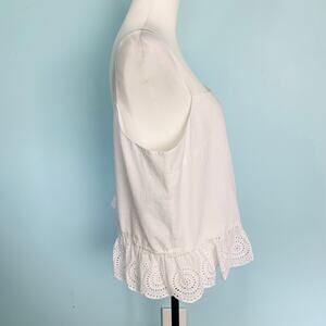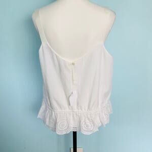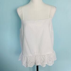 New with tags J. Crew Factory white textured top with eyelet detailing in size 14. This fresh and cute top is incredibly versatile, perfect for creating both casual and dressy summer looks! The beautiful detailing and structured fit are highlighted by the eyelet pattern and elegant grosgrain straps.