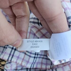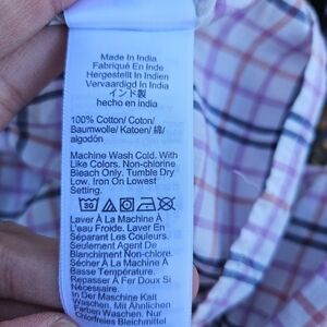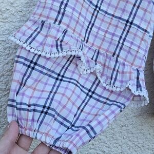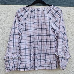 Long sleeve ivory plaid shirt with navy, pink, and purple, with ruffle trim on sleeves and shoulders.
