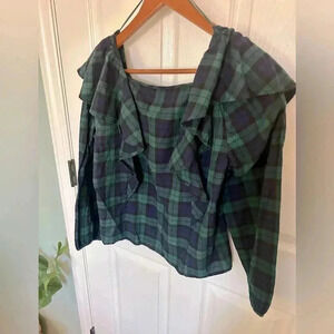 New with tags. Blue & green plaid top with ruffle. Perfect for the holidays! Measurements: 40” at bust & 22” long. 100% cotton. Machine wash.