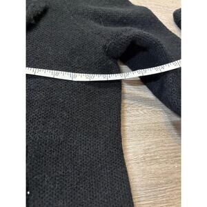 Chic black cardigan with front pockets. Features elegant gold tone button closure. Perfect for layering.