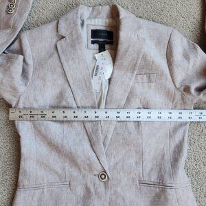 Brand new--pockets basted shut, back tacking stitch in place, no perfume smell or other issues. It's a lovely blazer--wonderful for the warmer months. Nautical buttons.