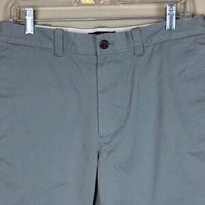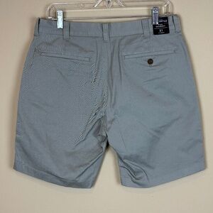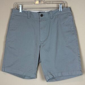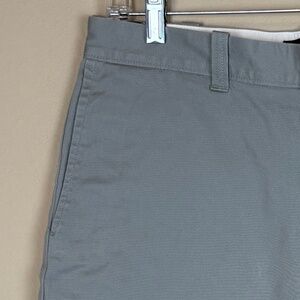 NWT J. Crew Mercantile Grayish Green Flex Gramercy Slight Stretch Cotton Blend Shorts; Size 31; When lying flat, measures 15.5" waist, 9" in-seam, and 10" rise; Fabric and Care instructions shown in pictures