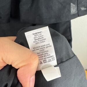 Black linen & cotton blend, pop-over styling, one-shoulder neckline with ruffle trim, lined, size XXS.