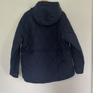 Lightweight and cozy jacket with curved quilted details, an oversized hood, and an adjustable drawstring waist for a flattering fit. Made from recycled polyester and filled with PrimaLoft, a warm and eco-friendly down alternative. Great for layering in cooler weather.